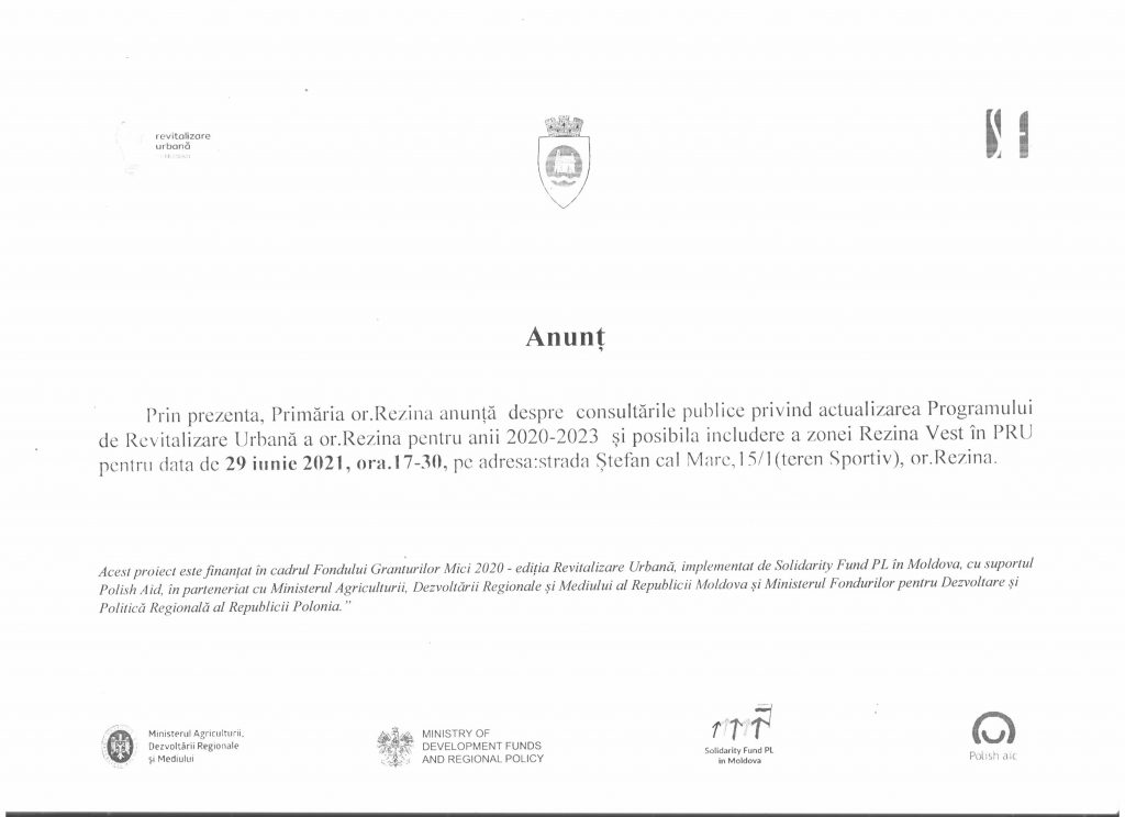 Prin prezenta, Primăria or.Rezina anunță despre consultările publice privind actualizarea Programului de Revitalizare Urbană a or.Rezina pentru anii 2020-2023 și posibila includere a zonei Rezina Vest în PRU pentru data de 29 iunie 2021, ora.17-30, pe adresa:strada Ștefan cal Mare,15/1(teren Sportiv), or.Rezina.