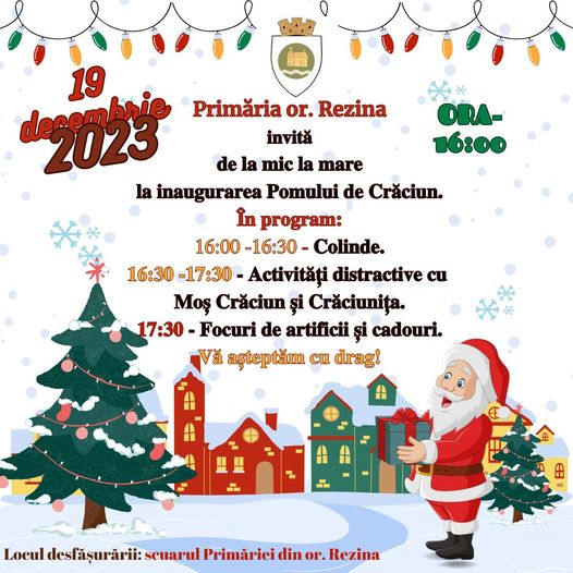 Avem plăcerea de a vă invita la evenimentul special inaugurarea Pomului de Crăciun în oraș, care va avea loc pe data de 19 decembrie 2023 la ora 16:00. Ne-ar bucura să vă avem alături de noi pentru a marca împreună începutul sărbătorilor de iarnă și pentru a aprinde luminițele de Crăciun într-o atmosferă festivă.
