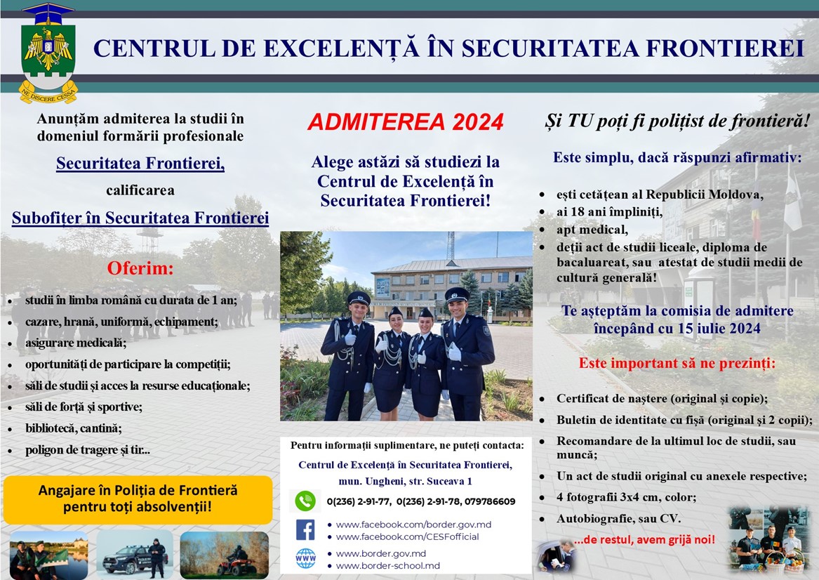 Admintere 2024 la Centrul de Excelență în Securitatea Frontierei! Pliant admitere Academia Ștefan cel Mare 2024 Pliant condiții de admitere la Academia Ștefan cel Mare 2024