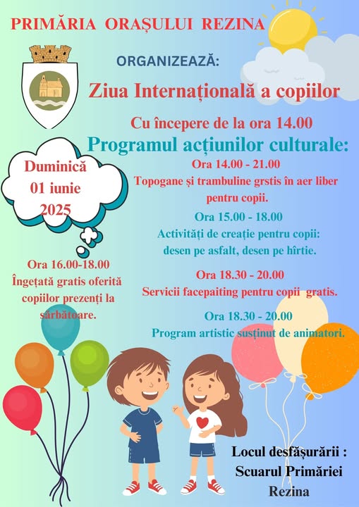 PrimÄria oraČului Rezina are deosebita plÄcere sÄ invite toČi copiii, pÄrinČii Či locuitorii oraČului la o ziĀ plinÄ de bucurie, culoare Či distracČie, cu ocazia Zilei InternaČionale a Copilului!