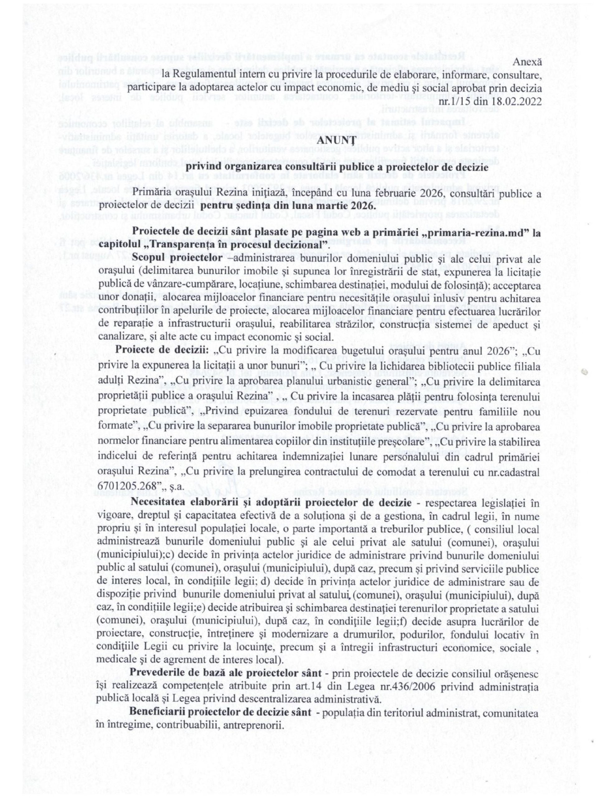 ANUNŢ privind organizarea consultării publice a proiectelor de decizie