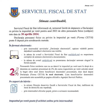 Stimate contribuabil, Serviciul Fiscal de Stat informează că, termenul limită de depunere a Declarației cu privire la impozitul pe venit pentru anul 2023 de către persoanele fizice (cetățeni) este data de 30 aprilie 2024. Declarația persoanei fizice cu privire la impozitul pe venit (Forma CET18) poate fi depusă prin următoarele metode: În format electronic: – […]